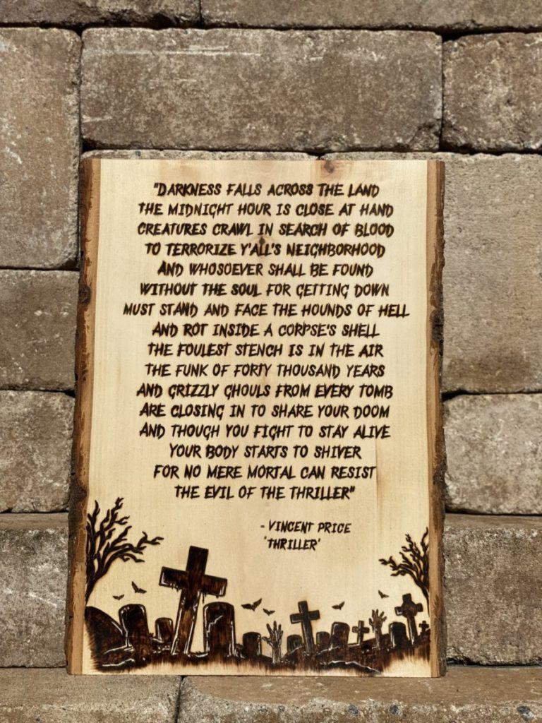 Our other product from our Halloween collection is one that we are particularly excited about. Next year marks the 40th anniversary of Michael Jackson’s Thriller video. As an homage to that video, we have created a limited edition plaque with the words of the great Vincent Price from that video. As with all our products, these are all made by hand and sealed with a heat-resistant, water-resistant polyurethane to ensure they hold up to the elements and stay beautiful for years.
