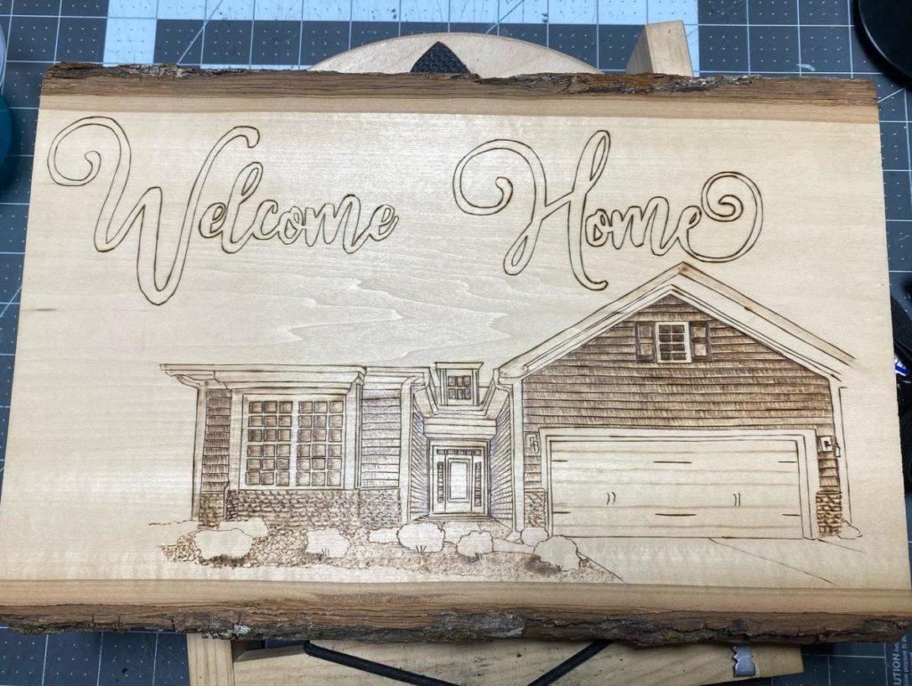 Our hand-burned “Welcome Home” signs are made to order specifically for you. We will take an image of your home and, using tried and true pyrography techniques, we will burn an image of your home into the wood. Hang it outside your door and greet your guests with a cheerful message or customize it with your family name or a special saying that means something to you.