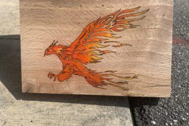 One’s home is a source of comfort, peace, and safety. We fill it with memories, laughter, and things that remind us of the best moments of our lives. Once I watched an artist paint a watercolor of a house and was inspired to do the same thing with pyrography. I had taken one of Renee‘s classes on textures and decided this would be a great opportunity to put this new skill to the test. On a whim, and as a personal challenge to myself, I did a burn of my own house. As with most artists, I am very critical of my work, analyzing every slight imperfection, however, I was still extremely proud of that piece regardless. This piece is prominently displayed at every market I attend as an example of what I can do and to inspire ideas in others.
