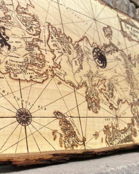 We were recently commissioned to create a hand-burned map of the seven kingdoms of Game of Thrones. The map features all the major areas of Westeros and Essos.